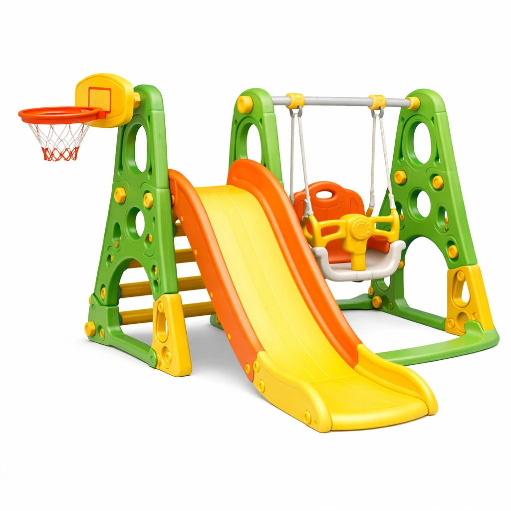Parque infantil con columpio y tobogán y canasta de baloncesto de plástico